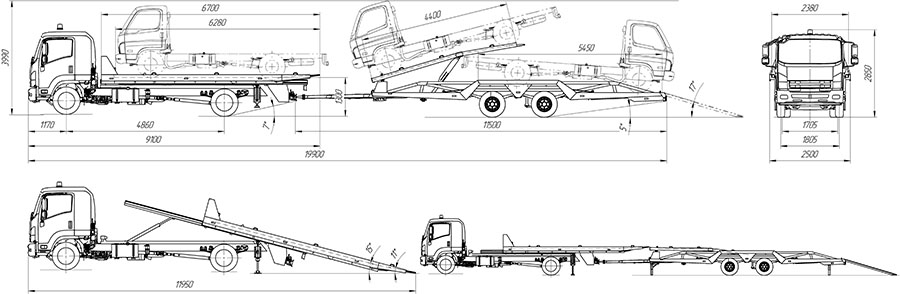 Перспективная разработка. Автовоз с прицепом на шасси ISUZU FORWARD 12.0 (FSR90). Автовоз представляет собой тягач со сдвижной платформой с прицепом, который оснащен подъемной платформой. Автовоз предназначен для транспортировки сразу трех грузовых среднетоннажных шасси или трех легковых автомобилей.