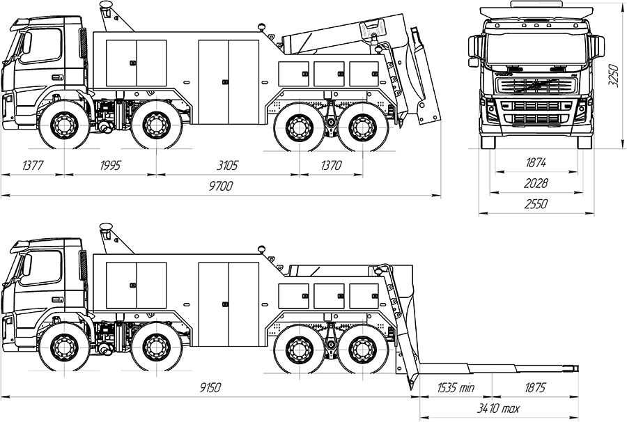 Грузоподъемность автоэвакуатора определяеется исходя из распределения масс по осям базового шасси. Конструктивно допустимая грузоподъемность надстройки составляет 10000 кг на полезном вылете 1535 мм.