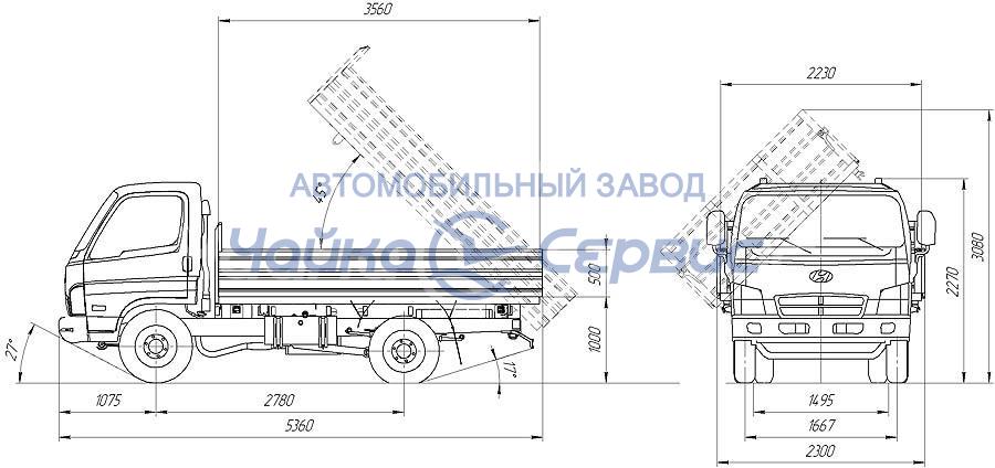 Самосвал с трехсторонней разгрузкой. Гидросистемы самосвалов изготавливаются из высококачественных комплектующих итальянского производства (DiNatale-Bertelli и OMFB), фурнитура производства АЗ "Чайка-Сервис".
