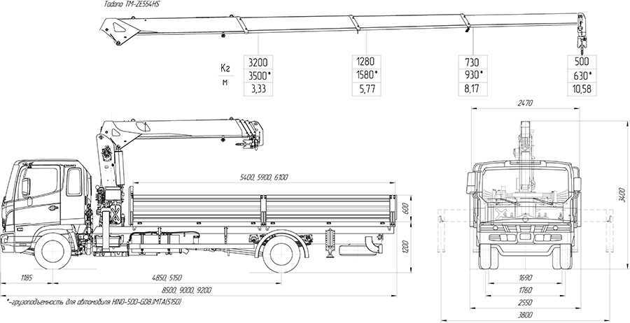 Автомобиль HINO-500 M2 (Япония) оборудован бортовой платформой и крано-манипуляторной установкой Чайка-Tadano TM-ZE504HS и имеет возможность не только проводить грузоподъемные работы, но и перевозить грузы.
