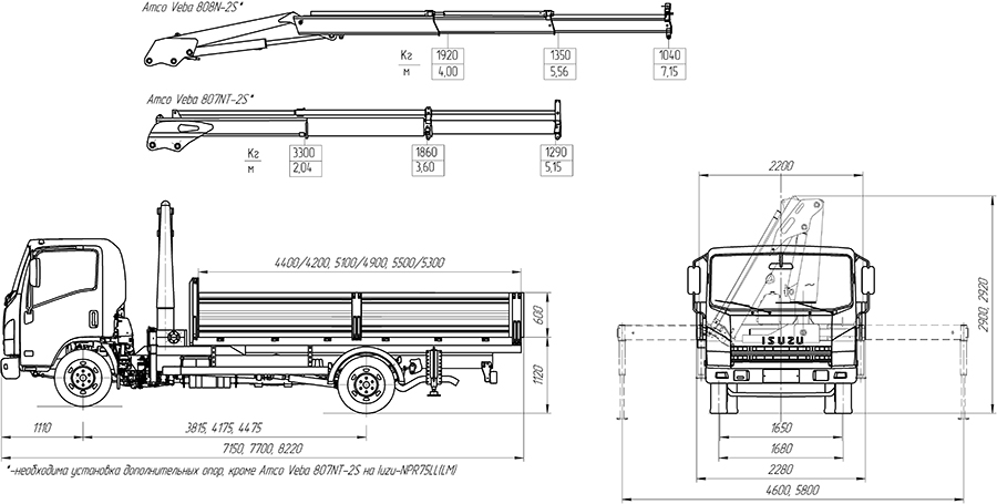 Автомобиль оборудован алюминиевой бортовой платформой и крано-манипуляторной установкой Чайка-Amco Veba с лебедкой и имеет возможность не только проводить грузоподъемные работы но и перевозить грузы. На шасси ISUZU ELF 7.5 (NPR75L) можно устанавливать краны серий "Стандарт" и "Т" с грузовым моментом от 1 до 6,3 т*м.