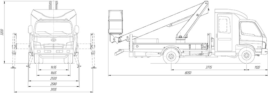 Автогидроподъёмник Чайка-Socage T318 с расположением над кабиной на базе Hyundai HD-78 с двурядной кабиной на семь мест «Чайка-7М» Телескопический автогидроподъёмник Чайка-Socage T318 расположен над кабиной, что делает его максимально компактным для перемещений по городу, и установлен на шасси Hyundai HD-78 с двурядной кабиной на семь мест «Чайка-7М». Кабина выполнена единым блоком, внутренние размеры спаренной кабины (ДхШхВ, мм): 2025×1945×1800. Новый автогидроподъёмник также может эксплуатироваться без выдвижения опор. Это позволит работать в узких запаркованных дворах или на оживлённых трассах. Аутригеры (опоры) в транспортном положении не выходят за габариты шасси. Для удобства обслуживания и легкого доступа оператора к корзине (люльке) автогидроподъёмника на крыше двухрядной 7-местной кабины «Чайка-7М» установлена площадка. Доступ к корзине в транспортном положении, без раскладывания стрелы подъёмника, позволит сократить время при эксплуатации, а также при техническом обслуживании и сервисных работах. Площадка оснащена перилами и настилом из рифленого алюминия, что исключит соскальзывание оператора при работах.