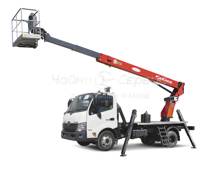Подъёмник представляет собой телескопическую стрелу с люлькой, установленной над кабиной над кабиной автомобиля.